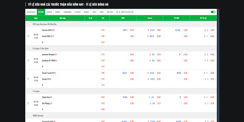 - Trang web sẽ hiển thị đầy đủ các loại kèo, tỷ lệ cược của các nhà cái khác nhau.